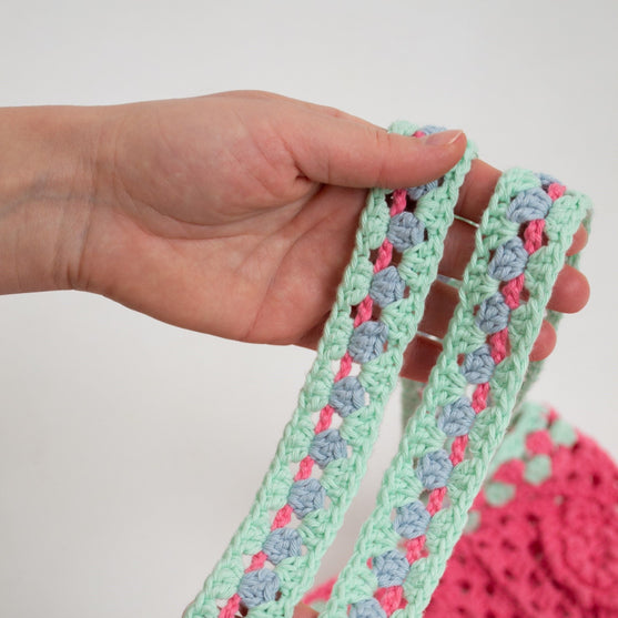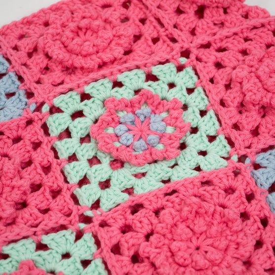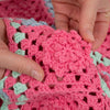 Este bolso consta de 30 cuadrados de ganchillo en diferentes combinaciones de colores, unidos a medida que avanzas. ¡Usa tu imaginación para combinar estos cuadrados en otras combinaciones y crear tu propio proyecto único de ganchillo! Necesitarás 6 madejas si deseas hacer el bolso en un solo color.