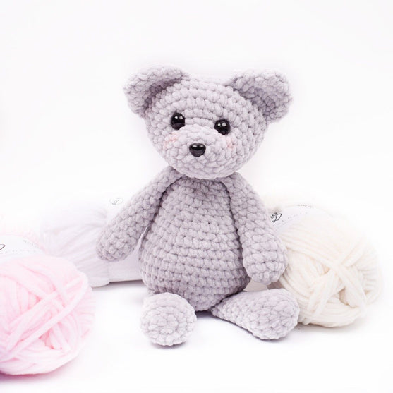 Está tejido a ganchillo con el ovillo Snuggle Solid, qun ovillo de microfibra extremadamente gordito y suave con una superficie estimulante sensorial. Es una muy buena opción para prendas y accesorios para bebés y niños :)