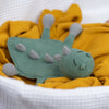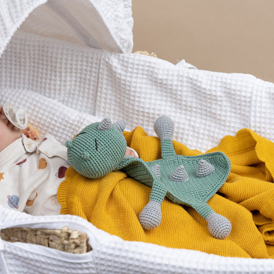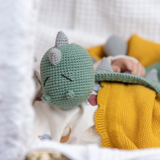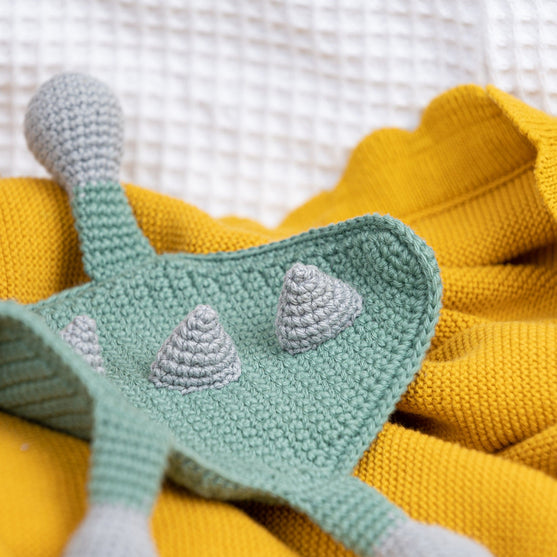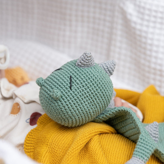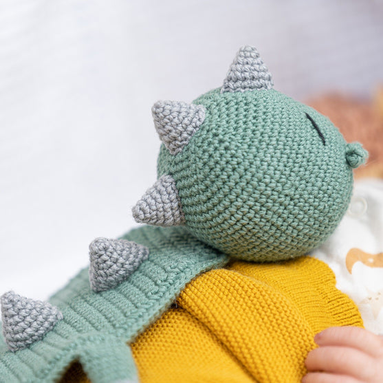 Aquí viene la frazada más cuqui del Dino Donnie. Es dulce y cariñoso y le encanta acurrucarse con un bebé y asegurarse de que el bebé sólo tiene dulces sueños.
