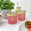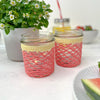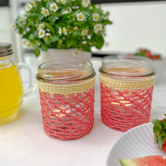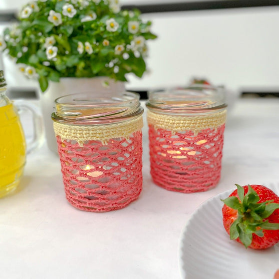 Hemos utilizado unos frascos de mermelada y hemos tejido una funda en patrón de malla con el hilo Rainbow 8/4, que viene en una gran cantidad de hermosos colores de verano.