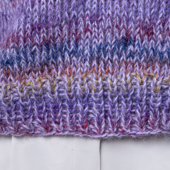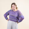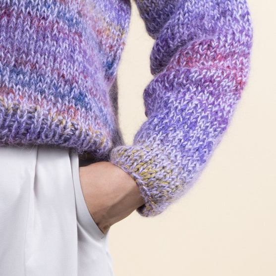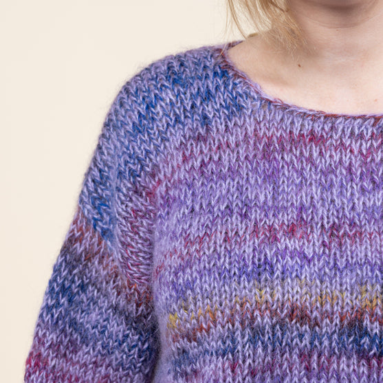 Se teje en dos hebras de hilo mezclado y la combinación de mohair, lana y acrílico hace que sea muy esponjoso sin pesar mucho. El hermoso juego de color en el hilo Manyana da mucha vida al jersey, que se puede tejer en una multitud de colores.