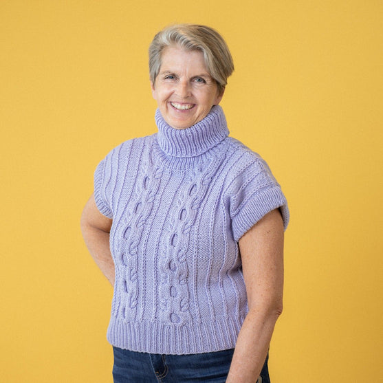 Simply Wintry es un cálido chaleco tejido de abajo a arriba en redondo. Se divide en las sisas y se termina cada lado por separado.