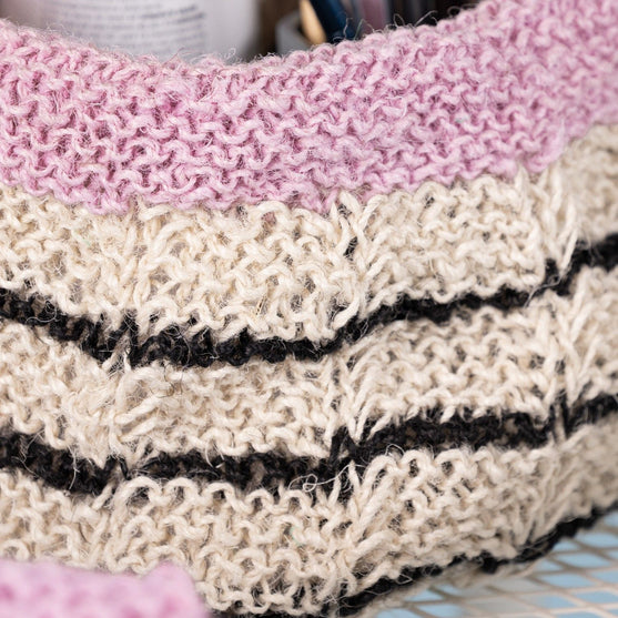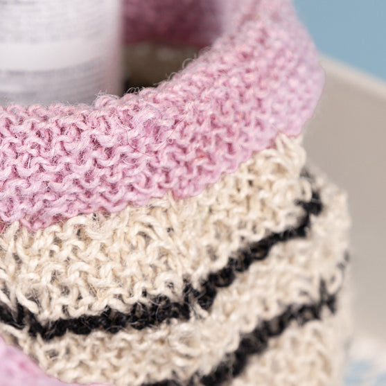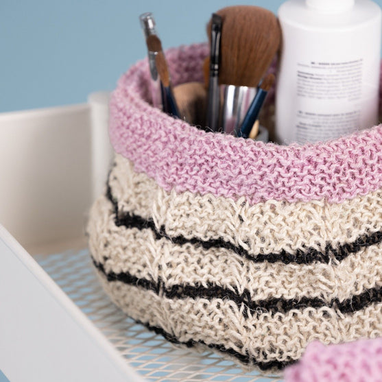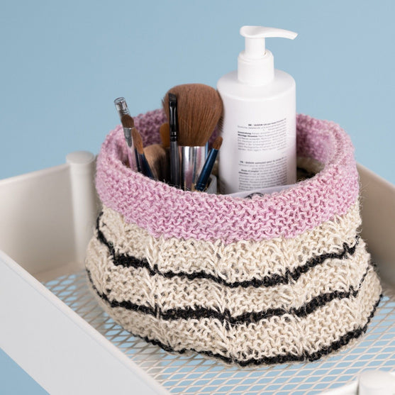 Budapest es una mini serie consistente en el patrón para una toalla exfoliante y una pequeña cesta. Ambos están tejidos en hilo de yute Judy, un hilo grueso y resistente que le da un aspecto rústico.