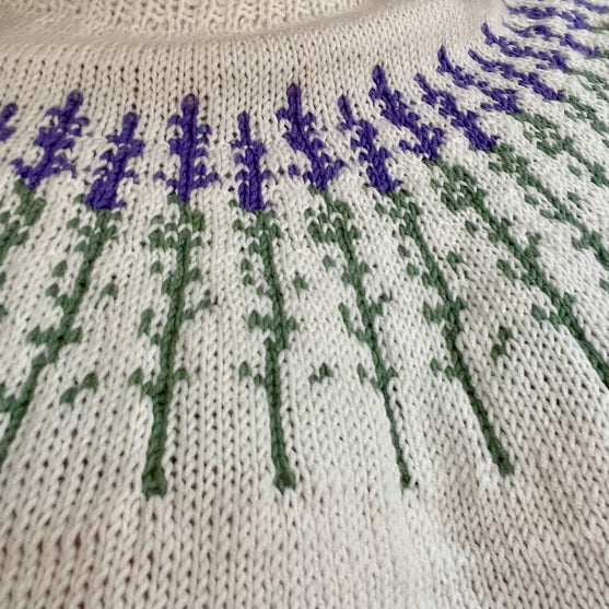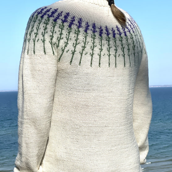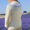 El jersey Lavender está tejido de arriba a abajo en Friends Extra Fine Merino. El jersey se teje con agujas de 3.0 mm y 3.5 mm. Para las mangas, puedes usar la técnica de magic loop.